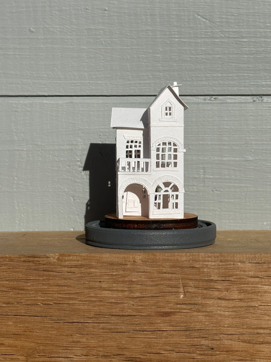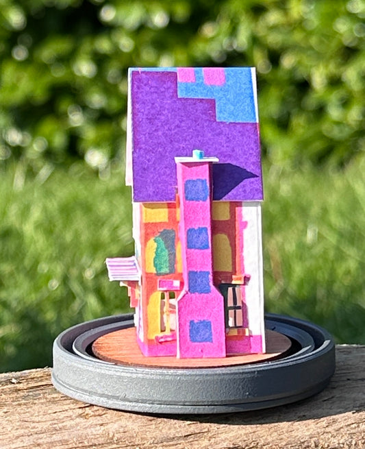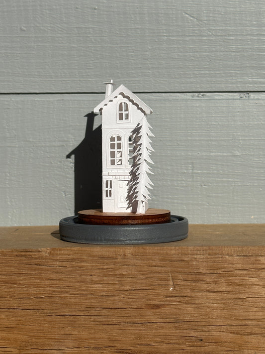 Each Tiny Dome House sits in a glass dome with a grey painted base. The dome is approx 9.5 cm high with an approx 6.5 cm diameter base.