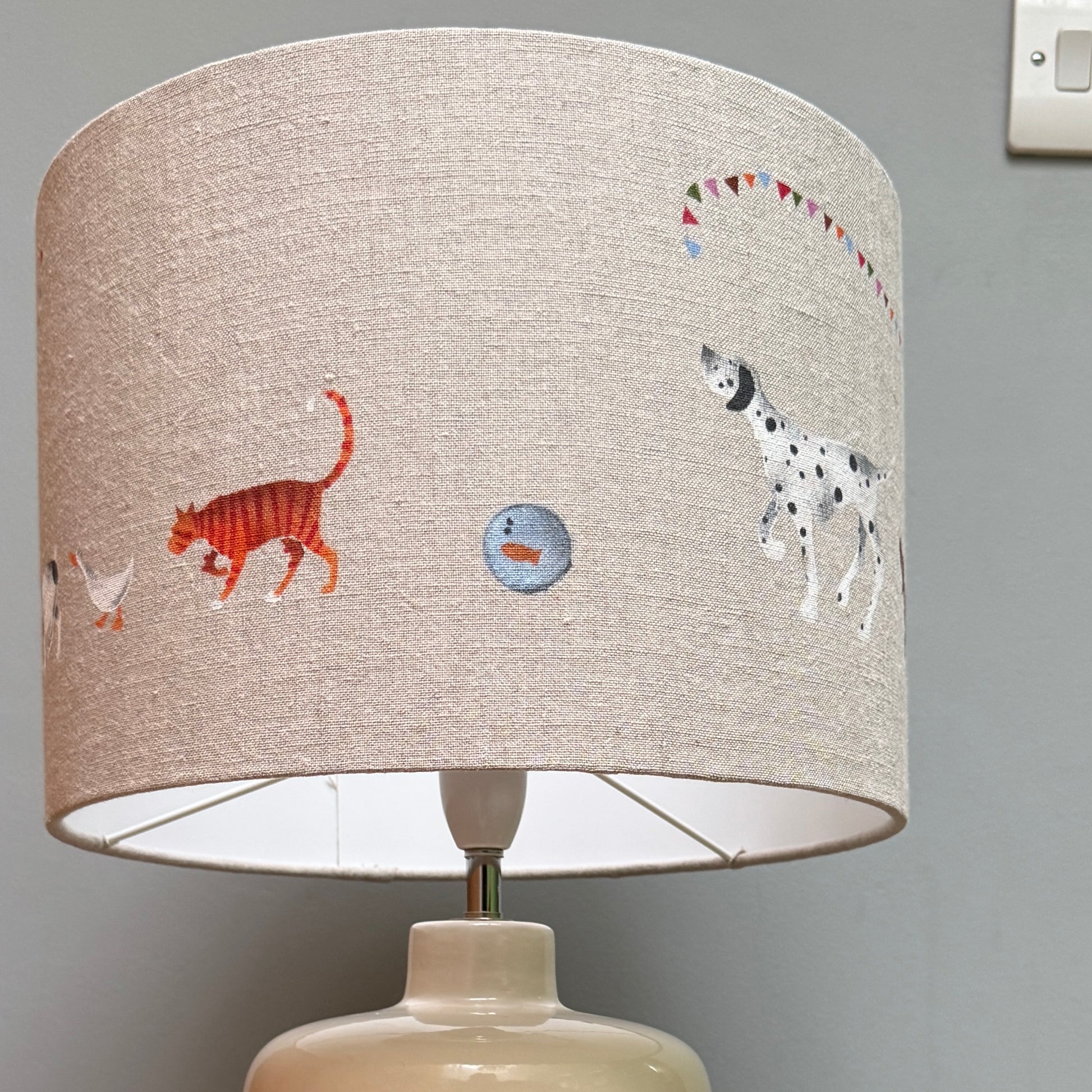 This lampshade features Hattie Dalmatian, Roger Sausage, Doris Dog, Stripes the Cat, Horace the Duck and Rover the Goldfish following each other around the lampshade twice printed onto Valencia natural 100% linen.