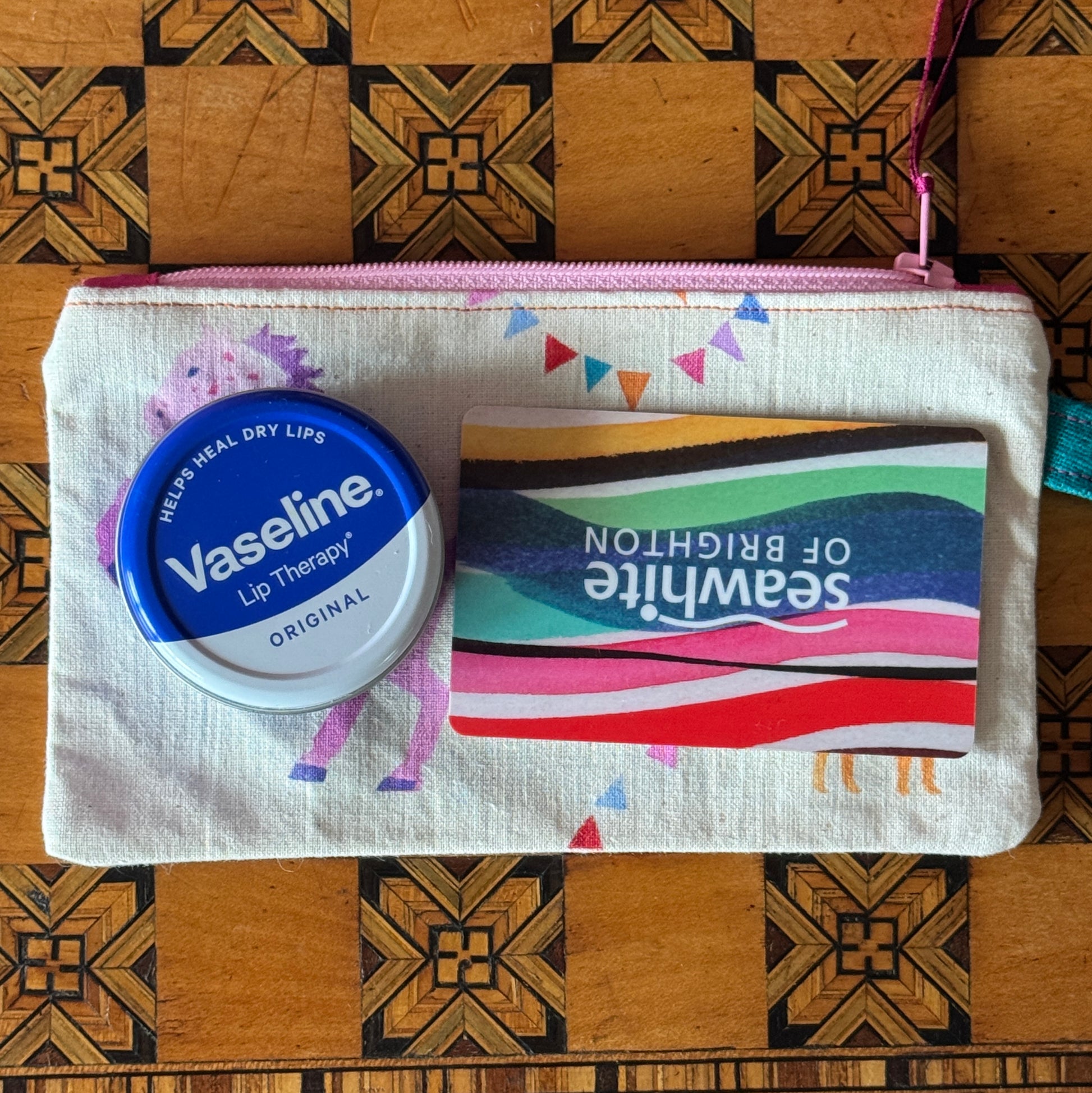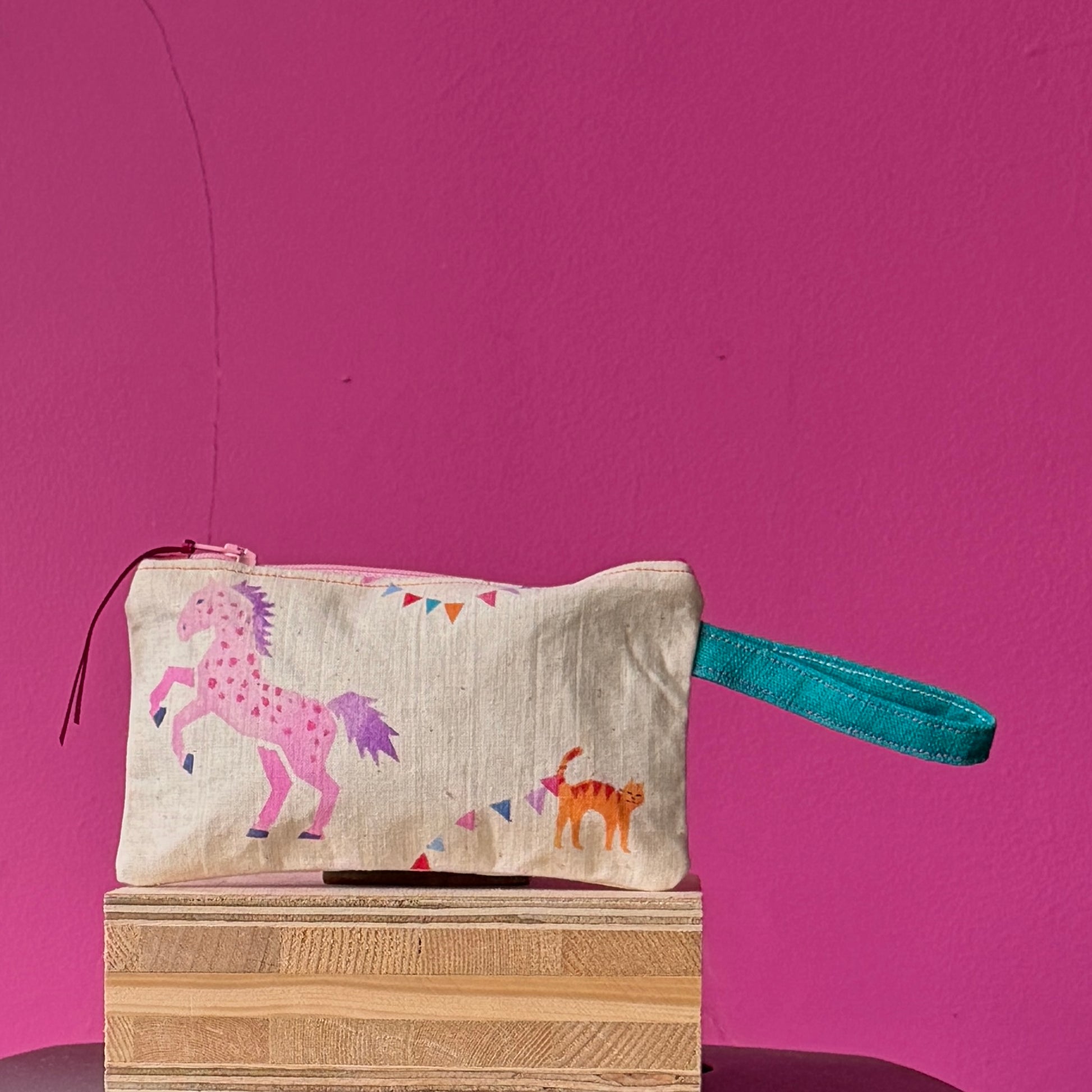 It features a blue pony and bunting on one side and a pink pony, a cat and bunting on the other. It has blue linen strap, a pink zip with pink tabs and a blue linen lining. The purse is 16 cm wide x 9 cm with a 12 cm zip opening. The strap is 9cm long.