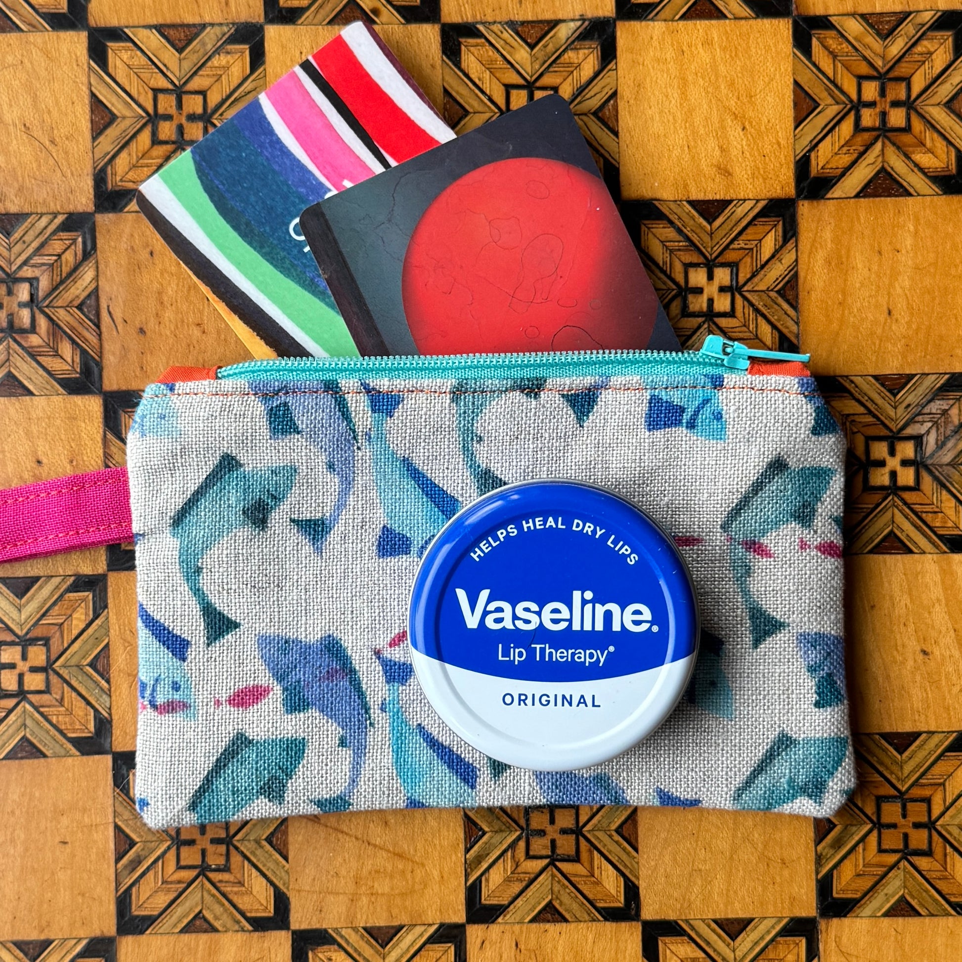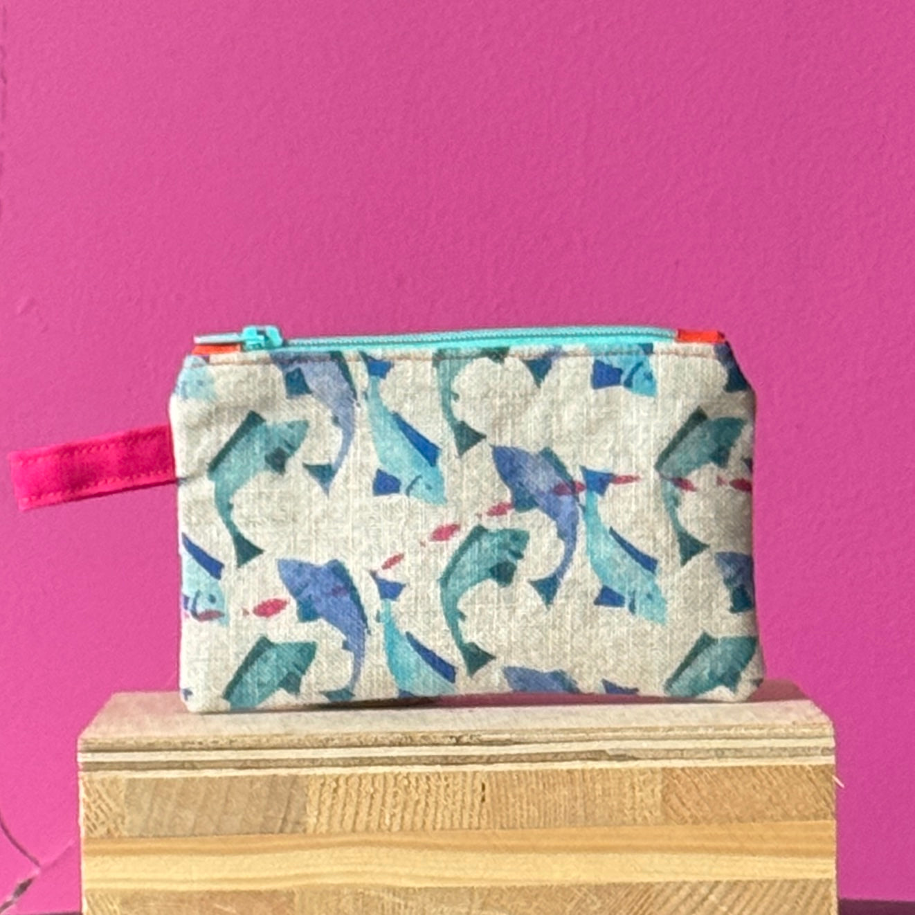 It features a pattern of dancing fish in blue tones , with a line of tiny pink fish over the top. It has a turquoise zip with orange tabs, a pink cotton lining and a short pink linen side tag.