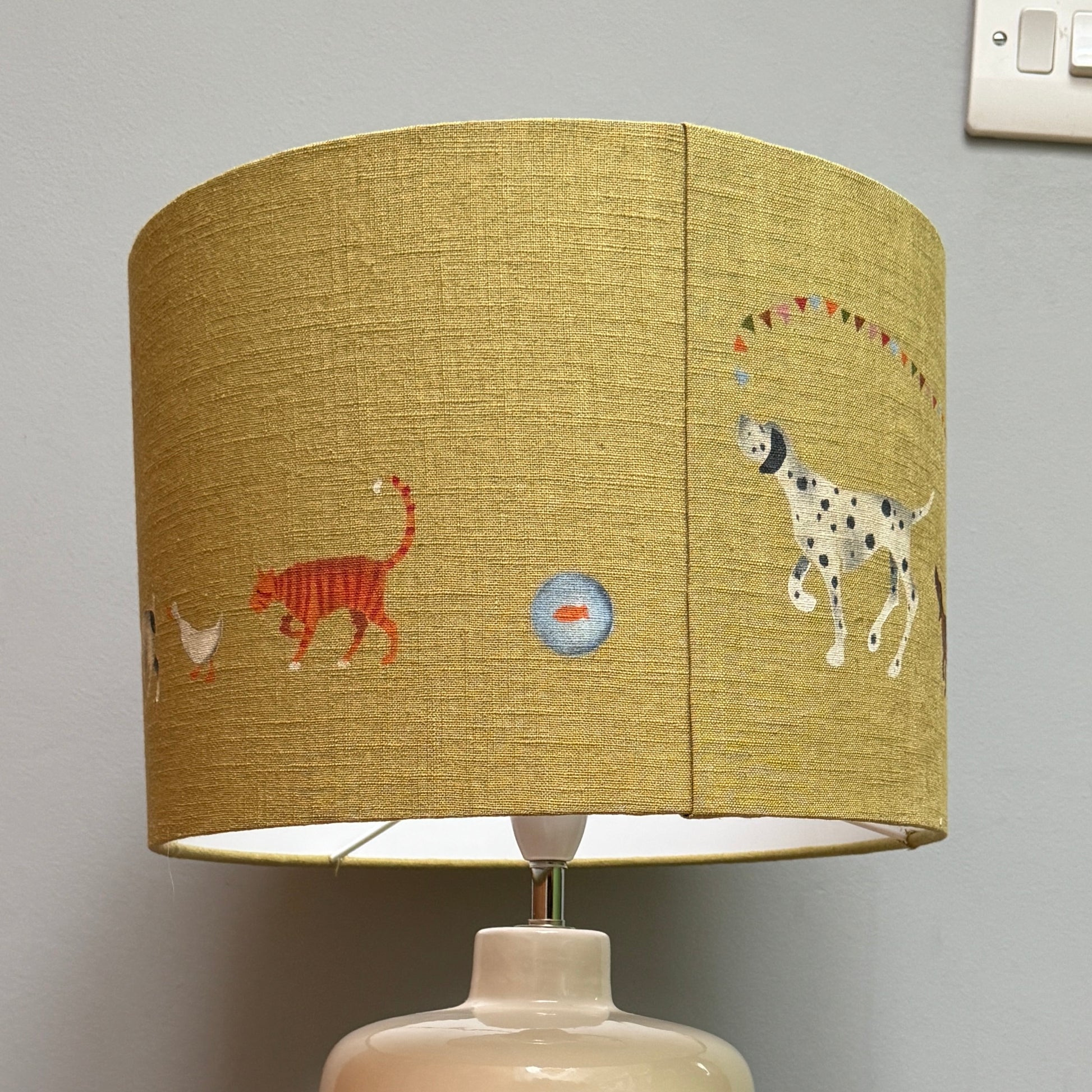 This lampshade features Hattie Dalmatian, Roger Sausage, Doris Dog, Stripes the Cat, Horace the Duck and Rover the Goldfish following each other around the lampshade twice, printed onto an olive green 100% linen.
