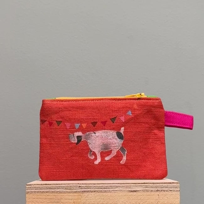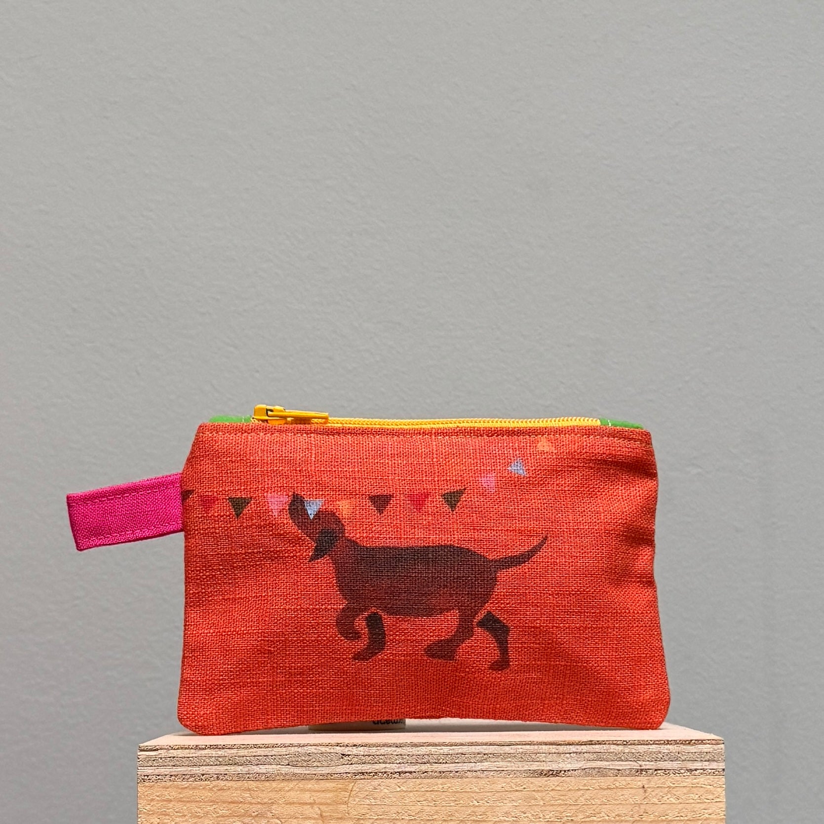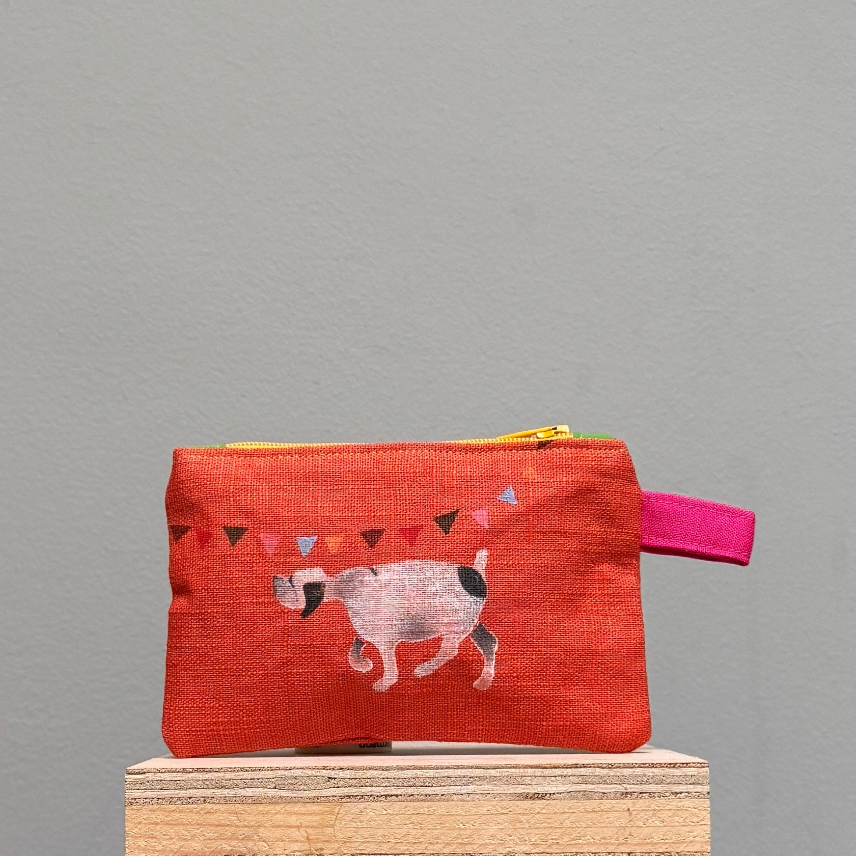It features Doris Dog walking under bunting on the front, followed by her friend Roger Sausage under more bunting on the back. It has a yellow zip with green tabs, a turquoise checked cotton lining and and pink linen side tab.