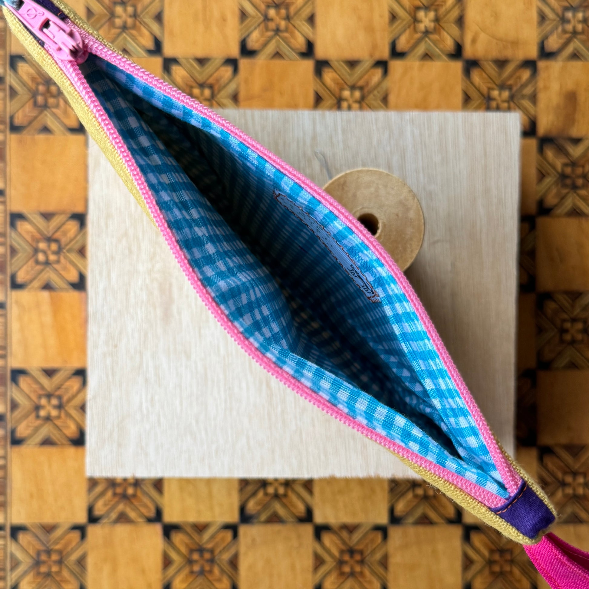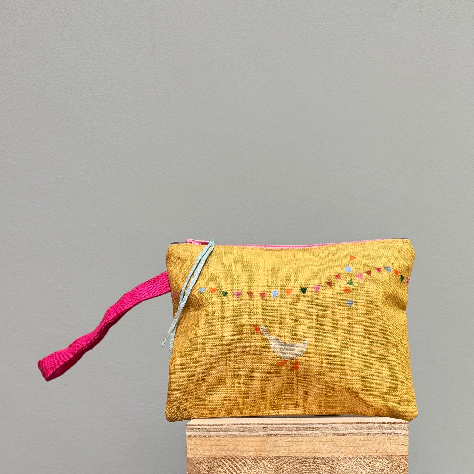 It features Sam Toft's very own Doris Dog and Stripes the cat on the front, the back has Horace the duck under some colourful bunting. It has a pale pink zip with purple tabs, a turquoise and white checked cotton lining and a pink linen strap.