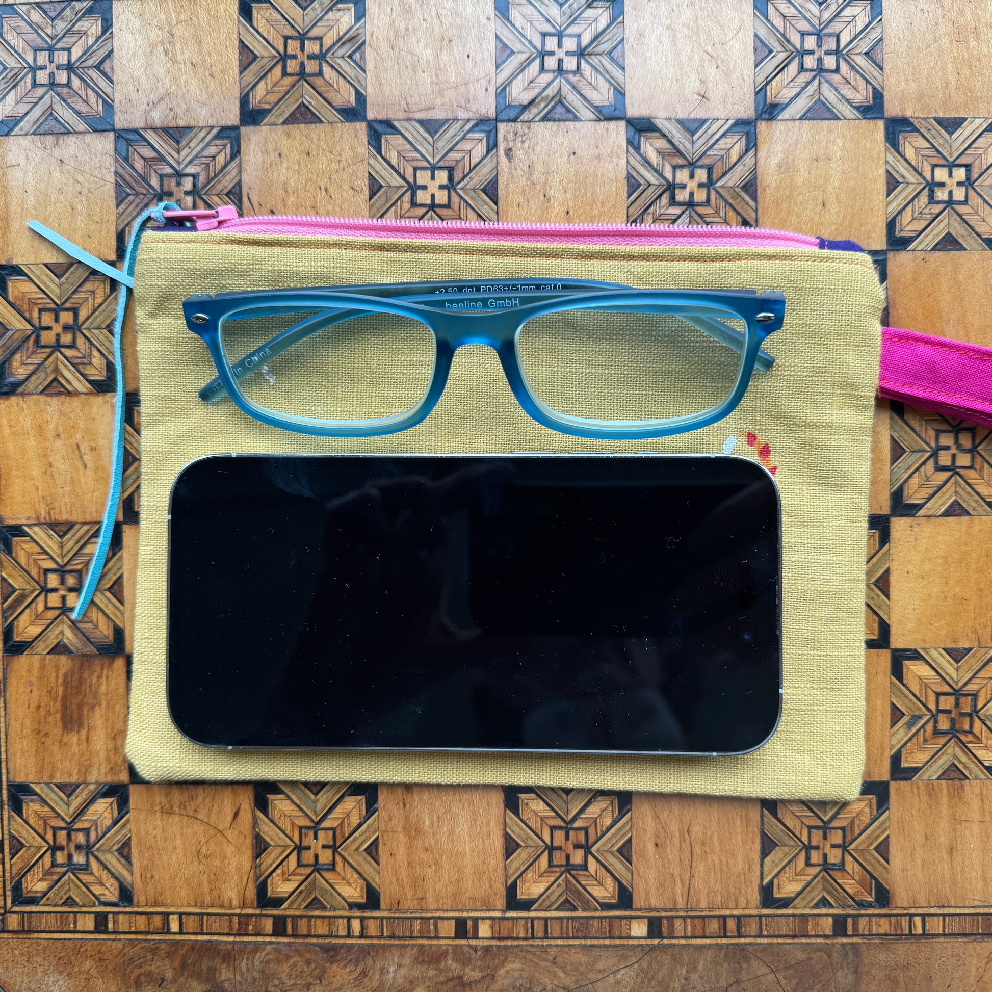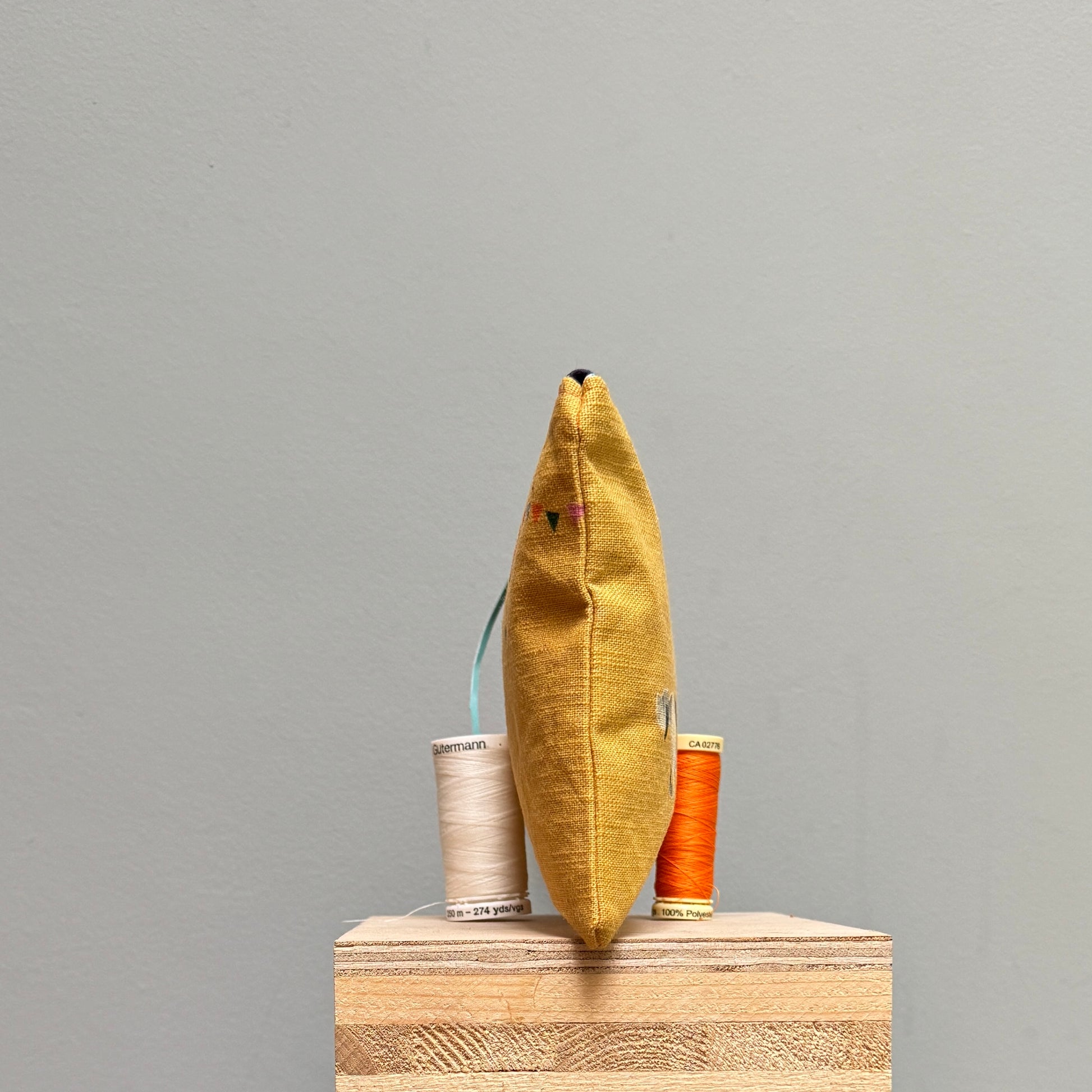 This lovely purse has been hand stencilled on to lovely yellow linen.