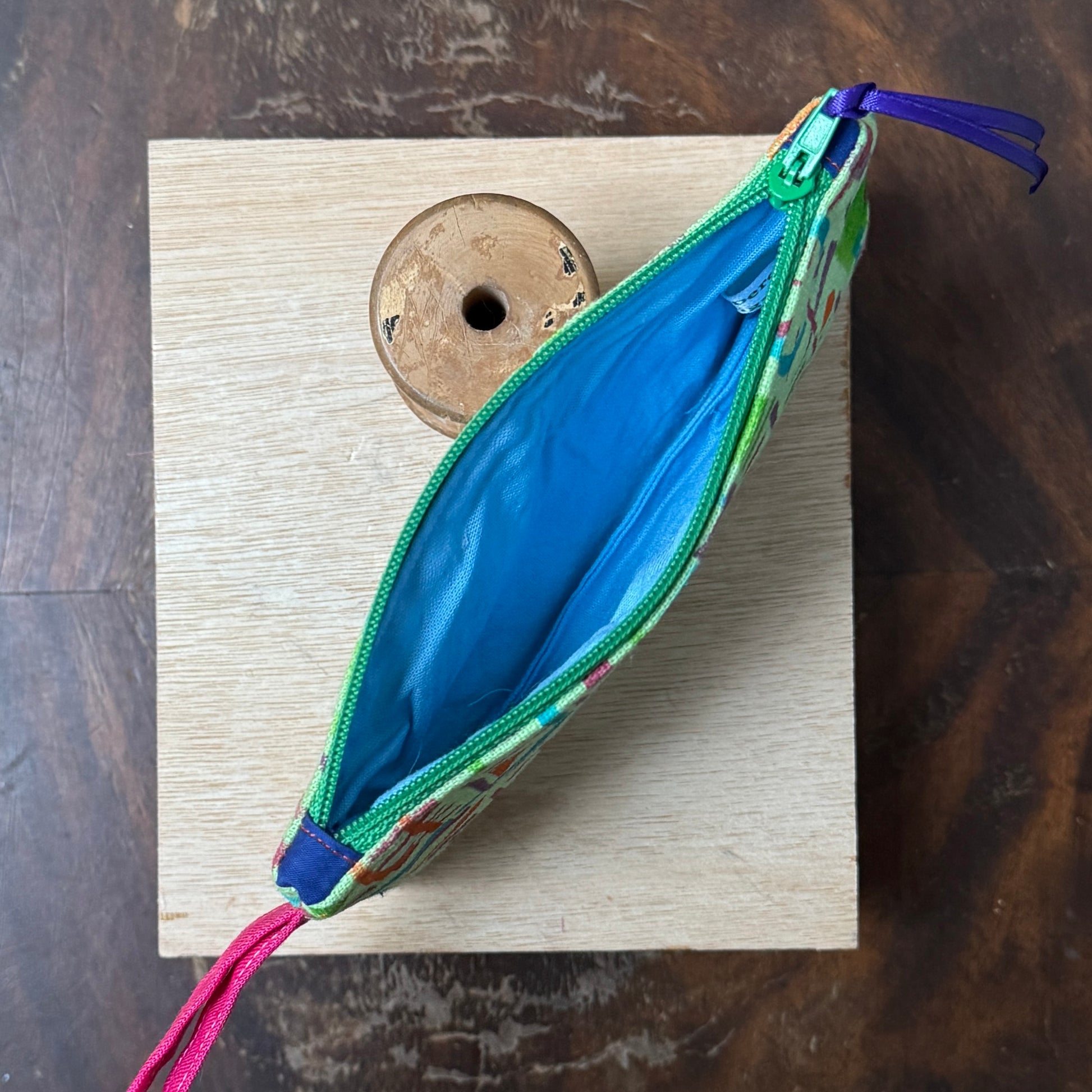 It features a series of geometric shapes in green, dark red, purple, turquoise and orange . It has pink linen strap, a green zip with blue tabs and a light blue linen lining.