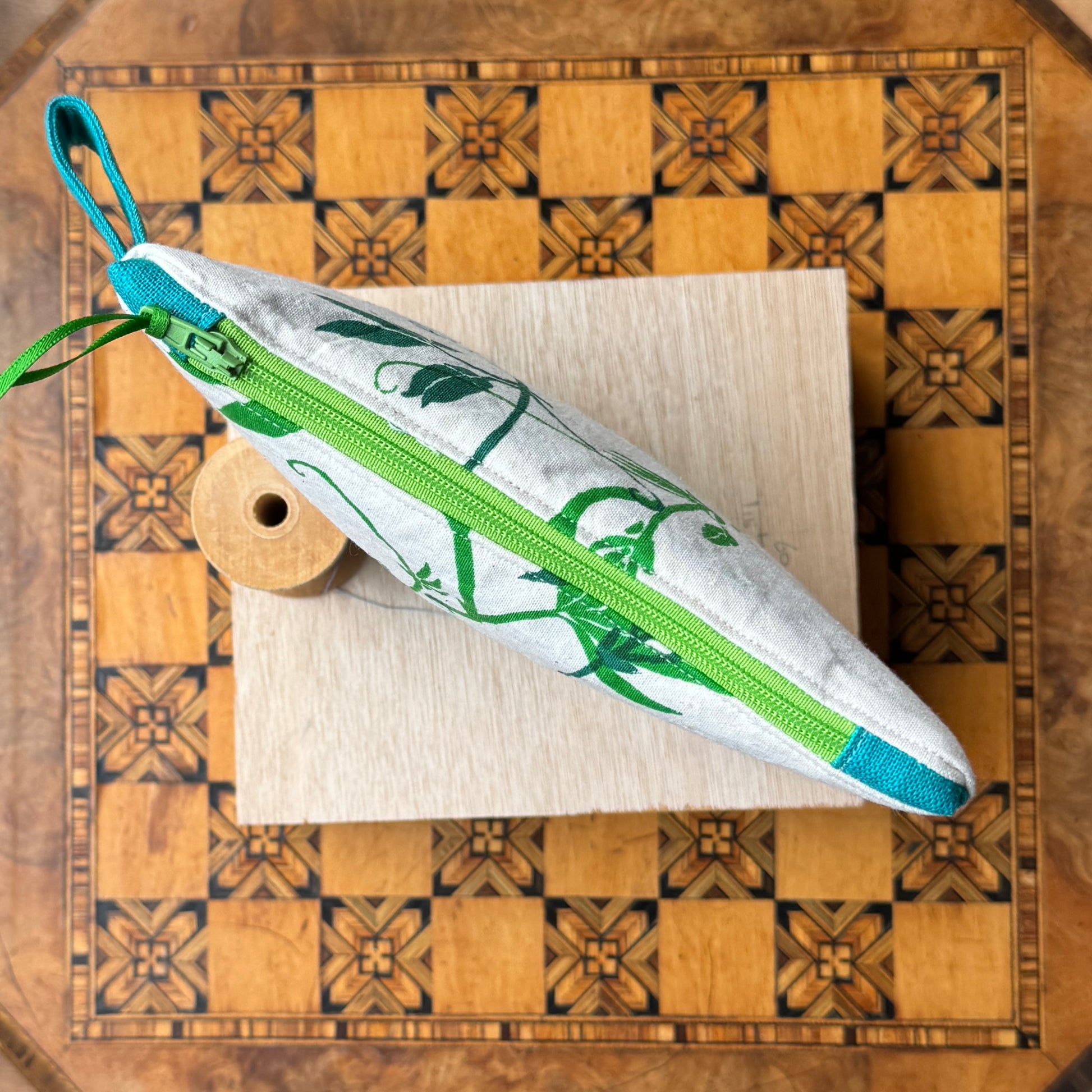 It features a two tone green Passion Flower plant design on both sides. It has a short turquoise linen strap, a green zip with turquoise tabs and a turquoise linen lining.