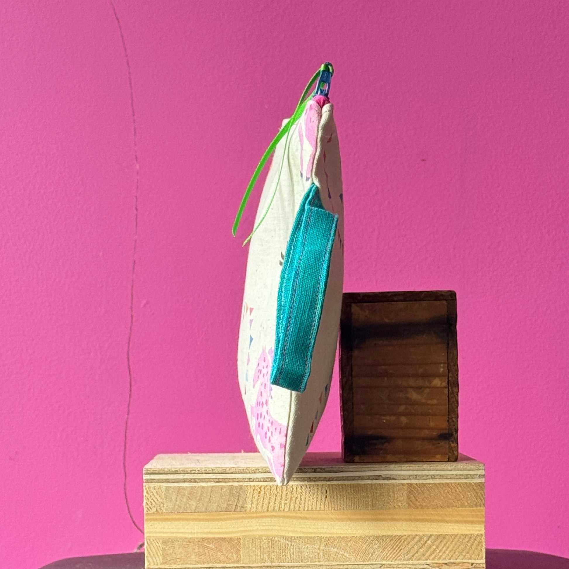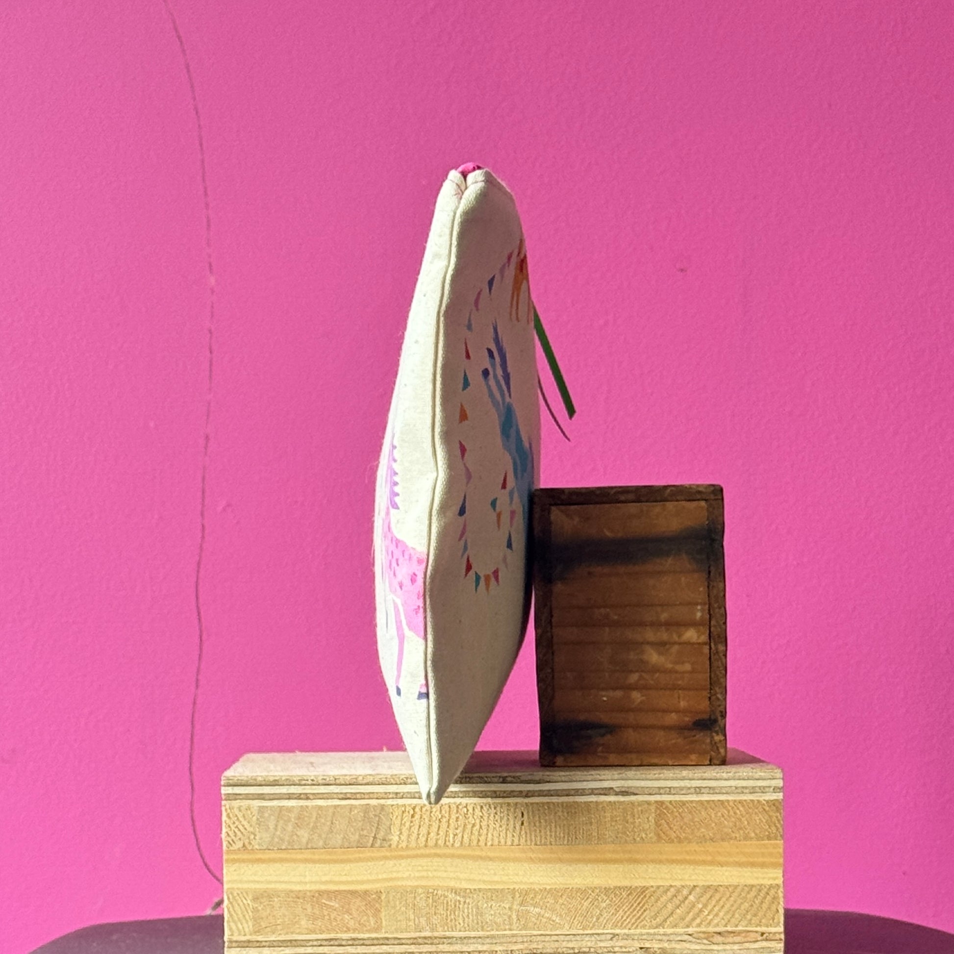 This lovely purse has been made by me using my hand stencil printed fabric design- The Pink Pony Club, printed onto natural oatmeal cotton.