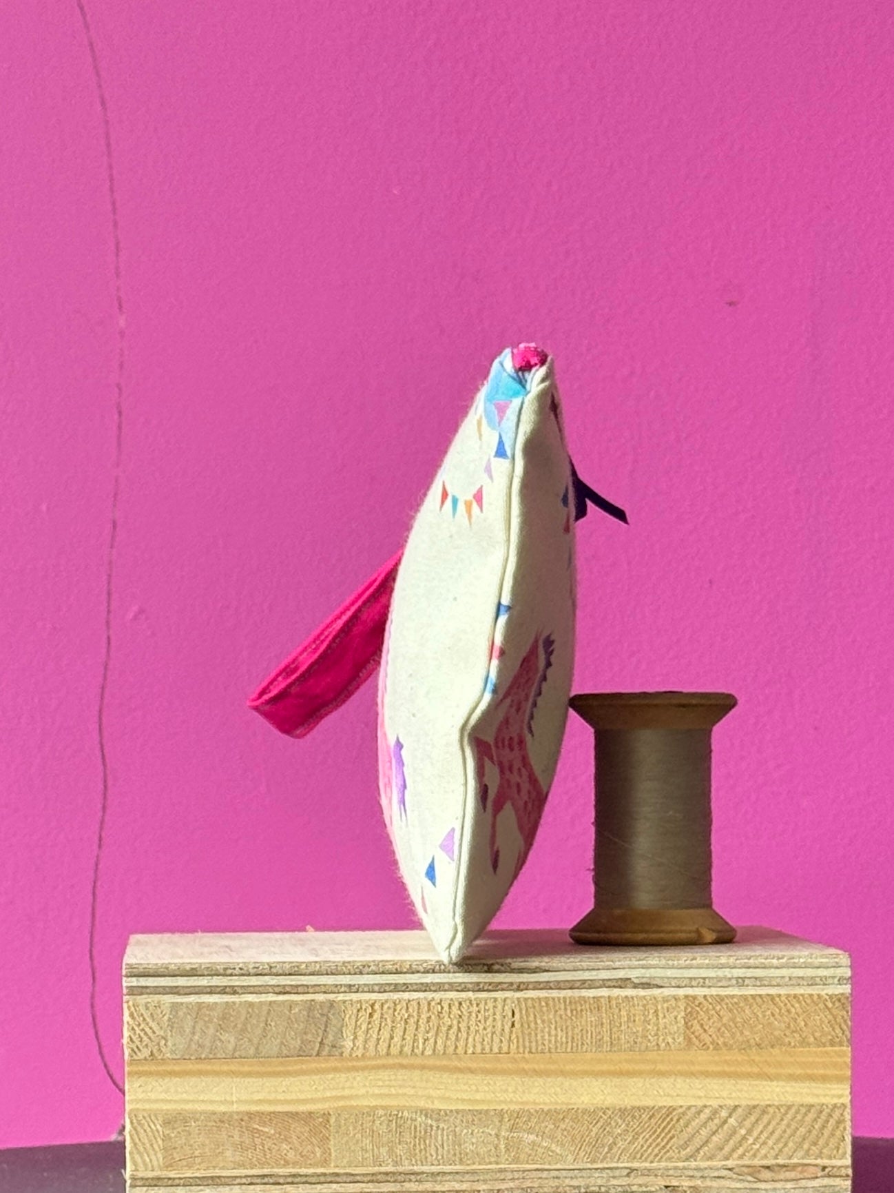 This lovely purse has been made by me using my hand stencil printed fabric design- The Pink Pony Club, printed onto natural oatmeal cotton.
