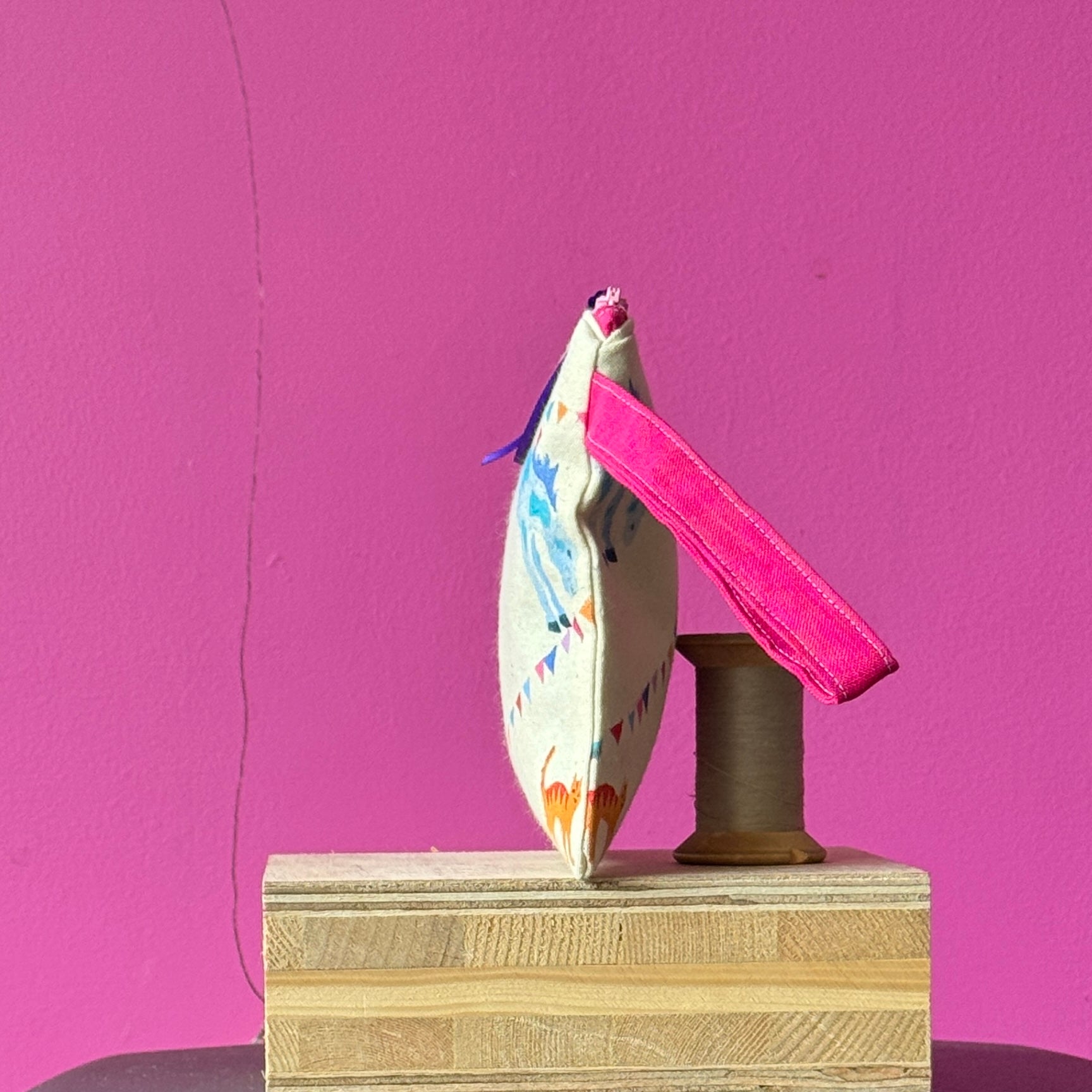 It features a blue pony, part of a pink pony a dog and a cat and bunting on one side and a blue pony, part of a pink pony, a cat, rabbit and dog with bunting on the other. It has blue linen strap, a blue zip with pink tabs and a pink and white striped cotton lining.