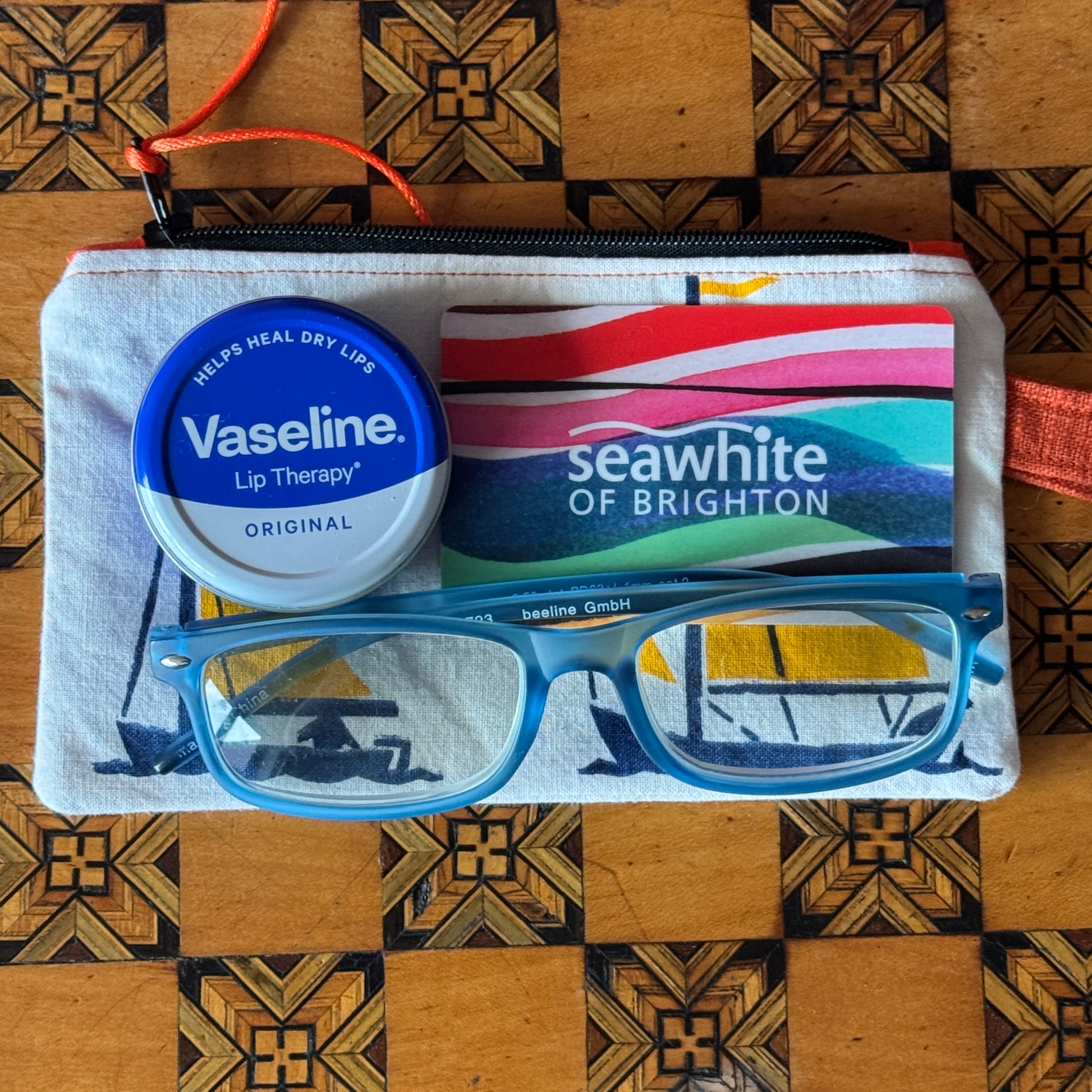 the purse usefully lined in dark blue cotton with a dark blue zip and orange tabs, the main body of the purse is a neutral cotton twill.