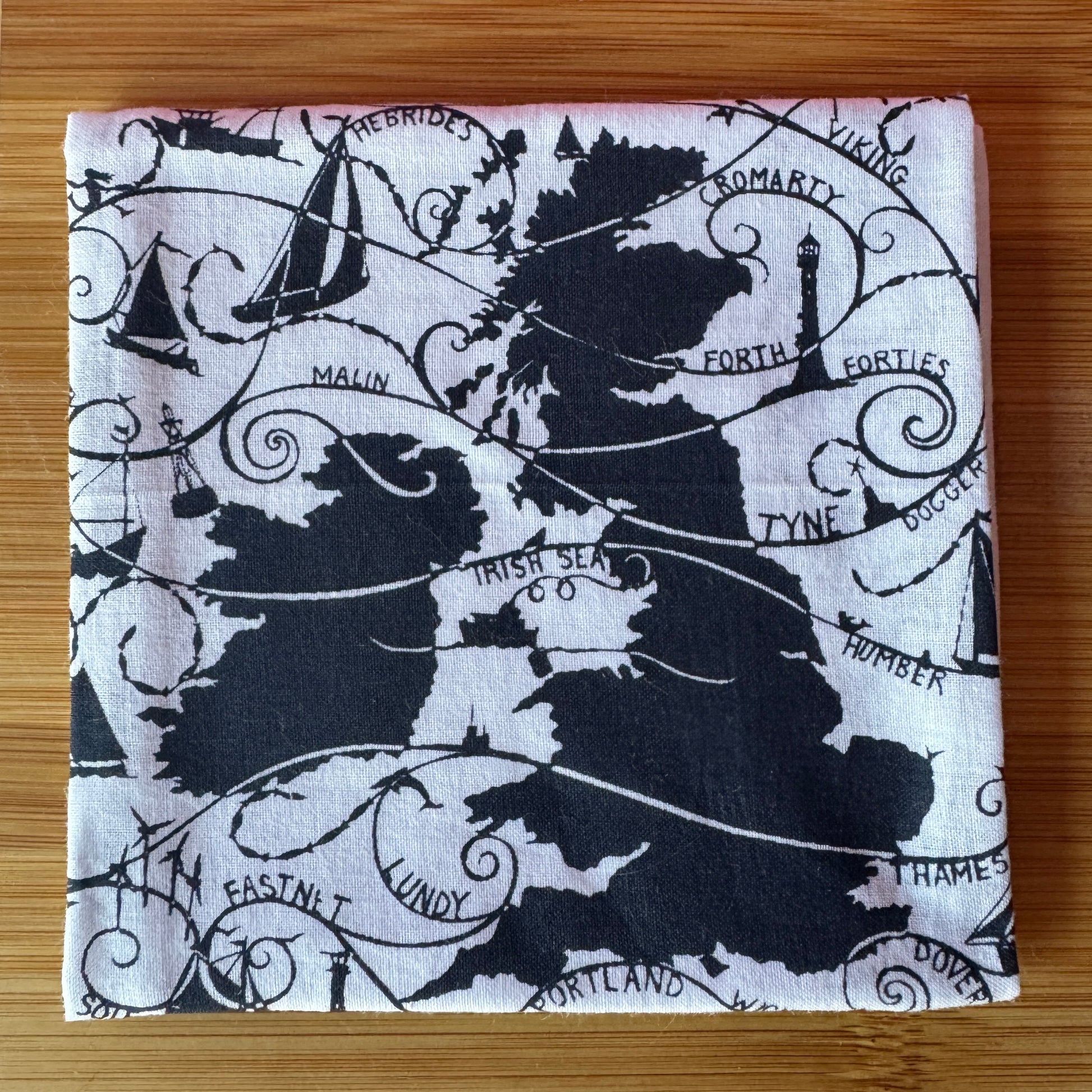 These 100% cotton handkerchiefs are hand silkscreen printed by me, from my "The Weather Report" handcut papercut featuring the Shipping Forecast areas.